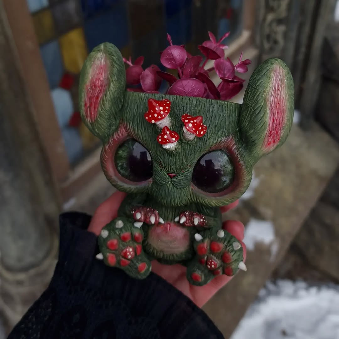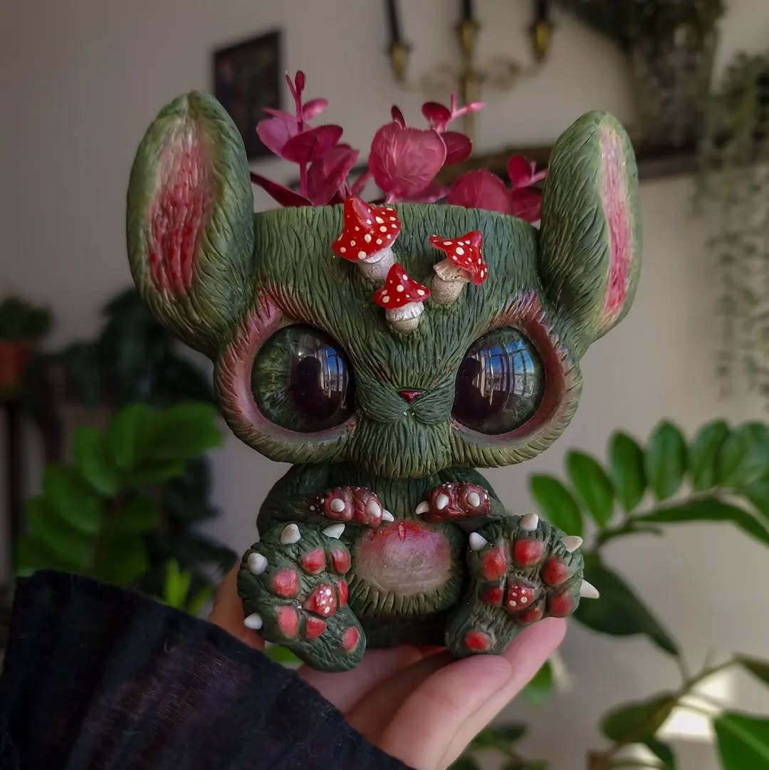 A forest clearing bathed in the golden glow of the setting sun🌄 Mushrooms of all shapes and sizes peeked out from the mossy ground🍄 — and between the red caps, a pair of long ears darted by🐰 A baby Almiraj appeared! 😍 Timid and cautious by nature, this magical bunny can be tamed with patience and kindness🤲❤️ The Almiraj’s base is adorned with natural prehnite, echoing the calm and magic of the forest🌿
