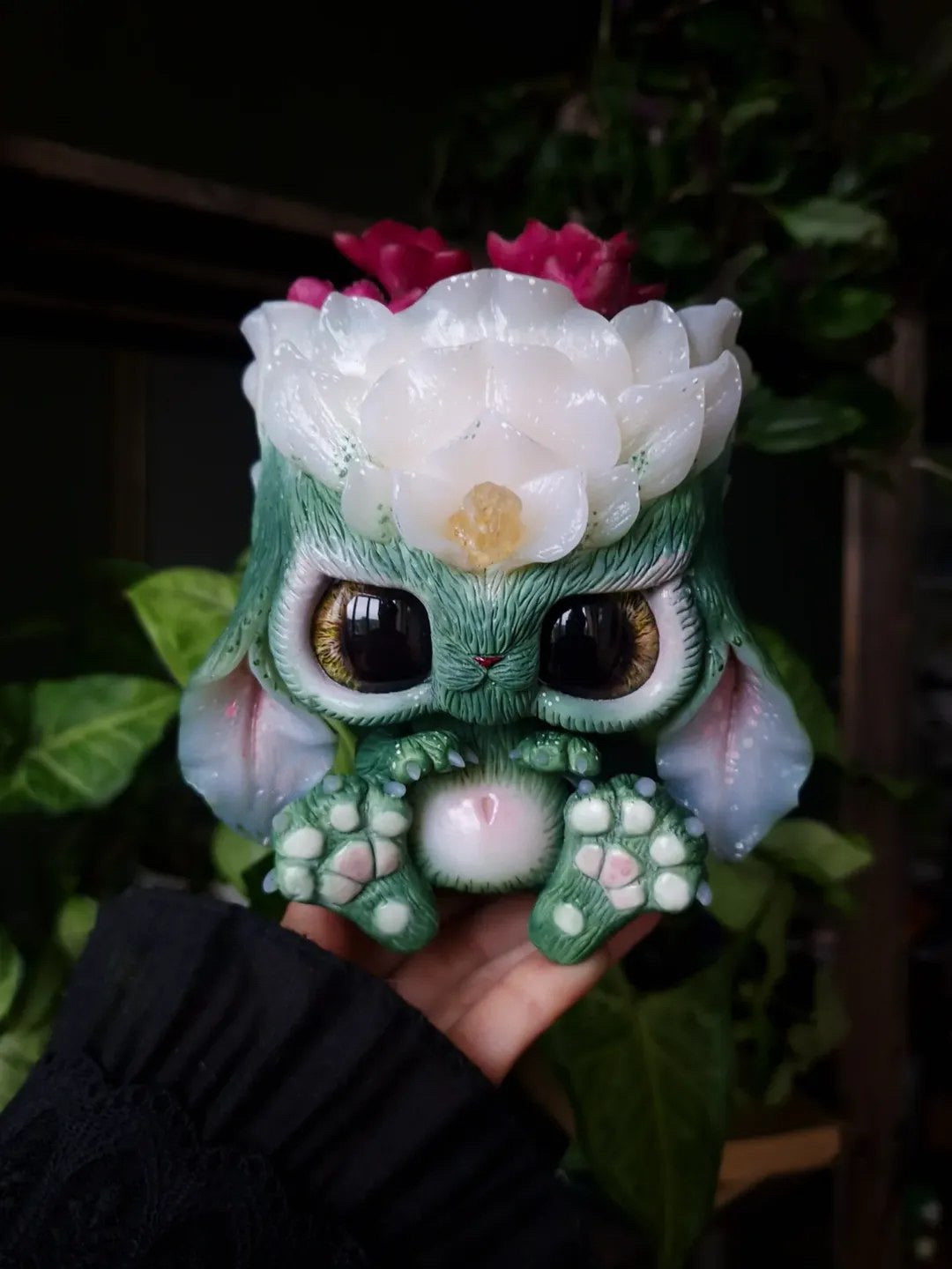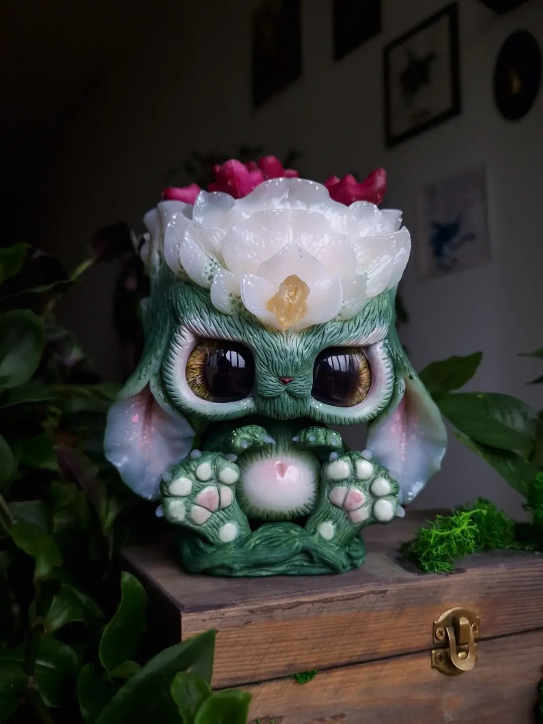 Such a summery little one! 😍 With the color of fresh grass 🌱 and a horn made of raw natural citrine ☀️, this Almiraj feels like pure sunshine and warm breezes wrapped in fur. A perfect companion for summer days and bright hearts! 💛🐇✨
