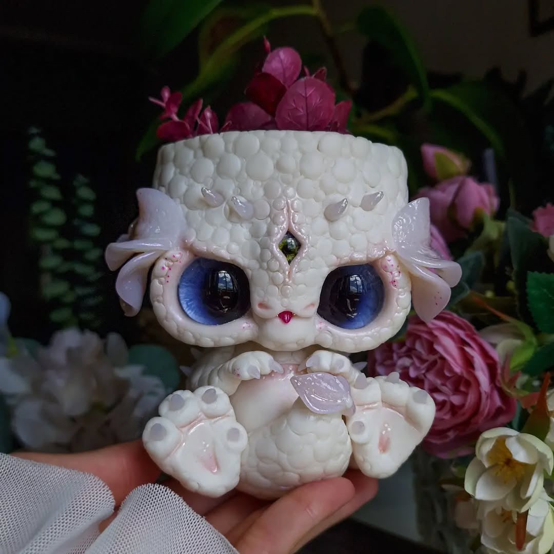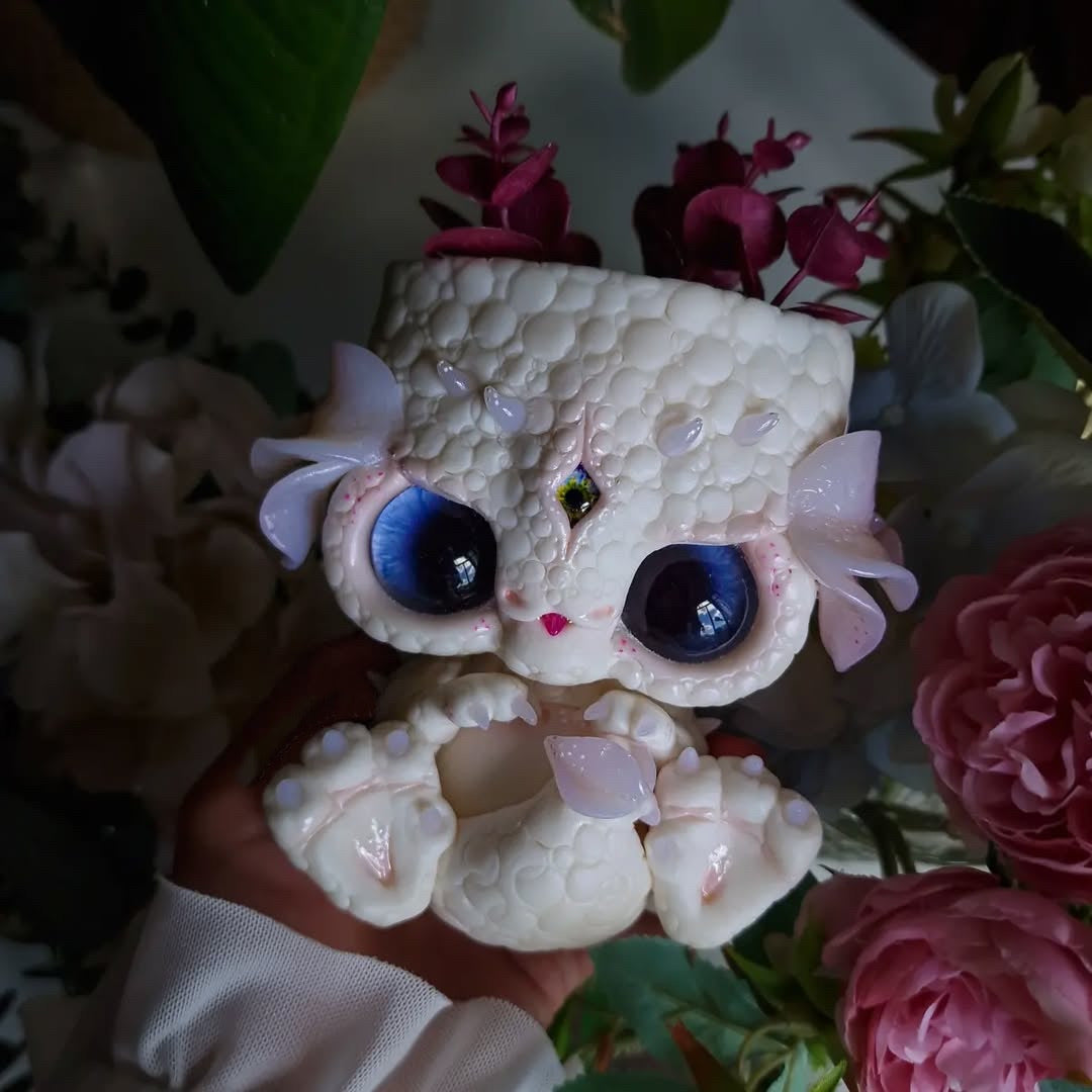 A gentle guardian of the garden moonlight🌙🌸 This magical creature looks as though it’s sculpted from porcelain dreams—pure white scales with a soft, pearlescent glow. Its giant blue eyes shimmer with kindness, and delicate lavender crystals bloom like petals around its tiny body💎🫧 A single glimmering green gem set in its forehead seems to hold ancient secrets… or maybe just a lot of love 💚 Perfect for anyone who believes in quiet magic and the beauty of soft things✨