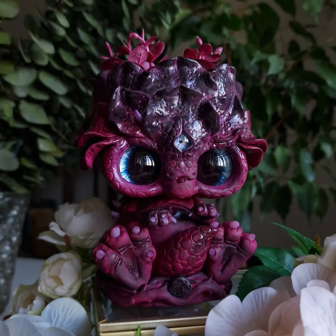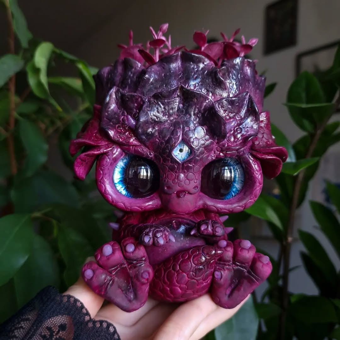 The First Dragon of Autumn 🍂🐉 With scales in a rich, deep purple hue, this magical baby marks the beginning of a new season. There’s something mysterious and warm about its coloring — like the last sunset of summer meeting the first chill of fall. Its planter base is adorned with natural garnet, a stone of passion and protection🖤✨ Perfect for this enchanting guardian of autumn.