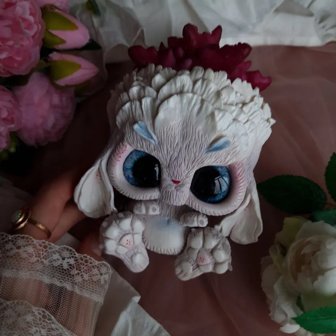 Fluffy Magic Baby 🐇✨ This little jackalope looks like it hopped right out of a fairytale! With delicate snow-white fur, giant sky-blue eyes, and soft petal paws — it’s pure tenderness in creature form. The base is adorned with natural moonstone, enhancing the gentle aura of this magical baby 🤍🌙