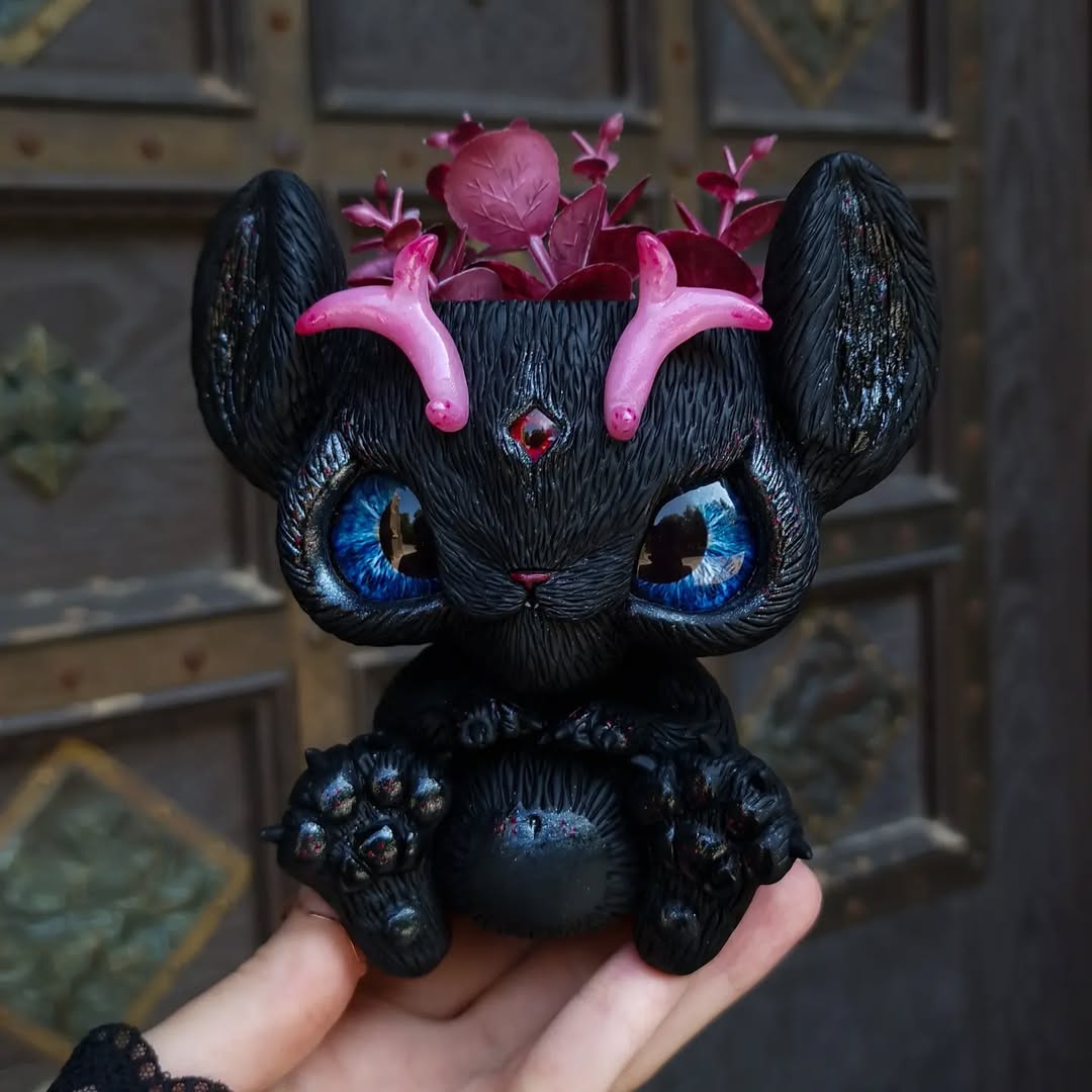 A lovely jackalope with pink antlers💕😍 Sweet and magical, with a soft sparkle in its eyes. The planter’s base is adorned with natural obsidian🖤 a grounding stone said to protect and hold ancient power. A perfect little forest spirit with a gentle twist of whimsy.