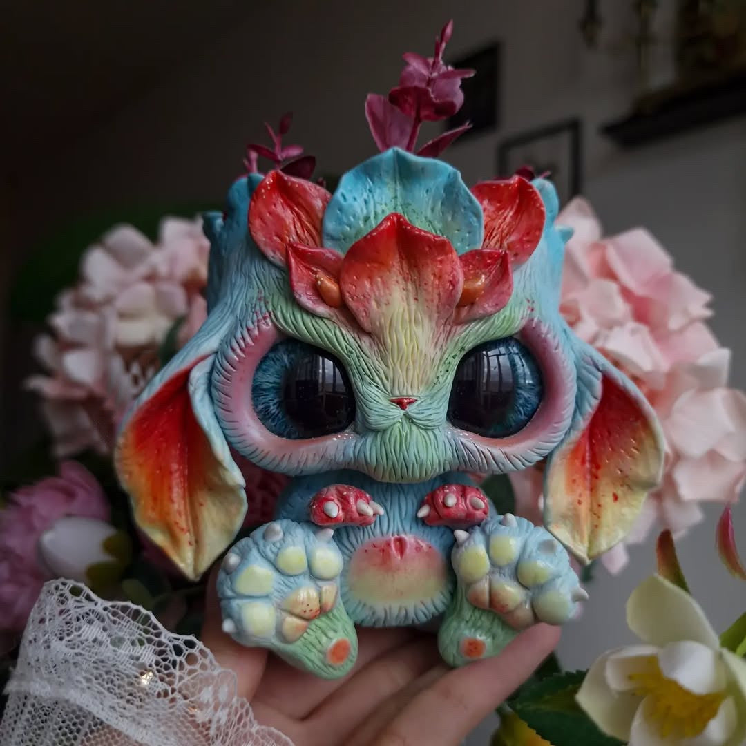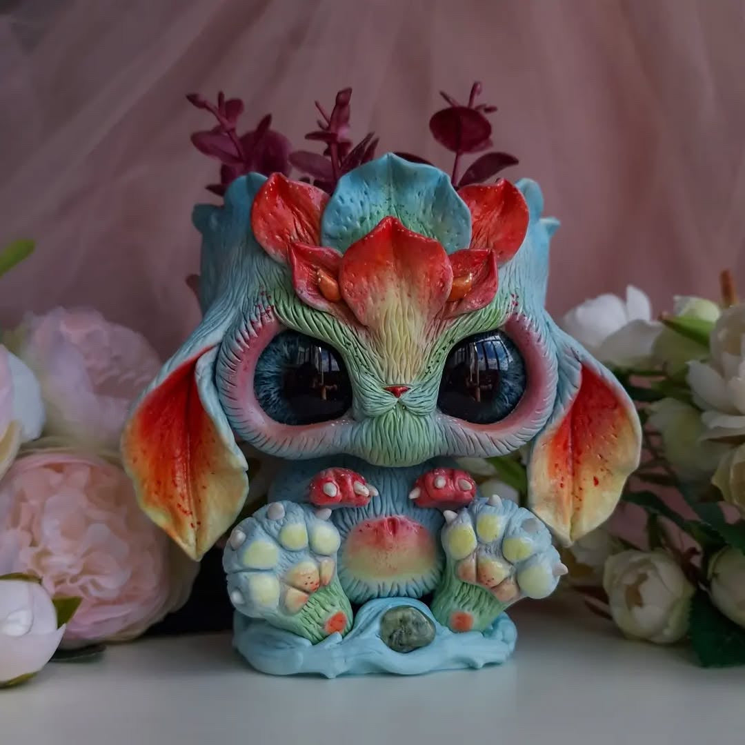 A vibrant little forest bloom bursting with magic and color! 🍄🌈 This baby almiraj has the most unique palette — soft turquoise fur, fiery red-orange petals, and sunny yellow paws that look dipped in stardust✨ The playful mushrooms on its belly and the shimmering green stone on the base make it feel like it just hopped out of a fairytale glade🌿 A true treasure for any forest spirit lover!