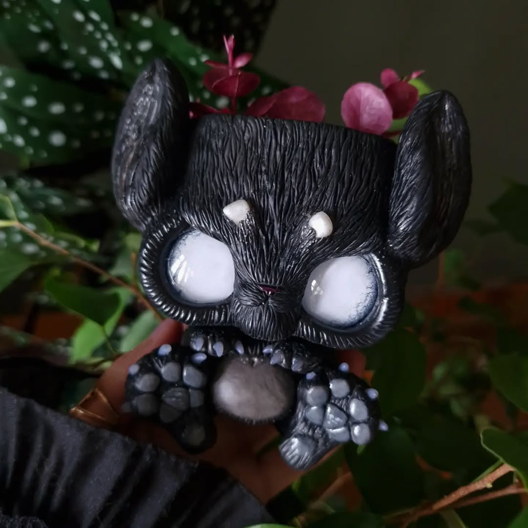 Midnight Gaze 🌑✨ A mystical creature of the night, this baby Almiraj is cloaked in deep black fur and has mesmerizing white eyes that glow like twin moons. Its look is both haunting and heartwarming — like it came straight from a dream. The planter base is adorned with natural moonstone, capturing the soft shimmer of lunar light and enhancing the magical aura of this dark little guardian🌕💫