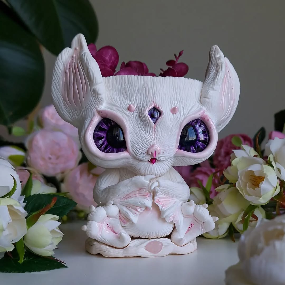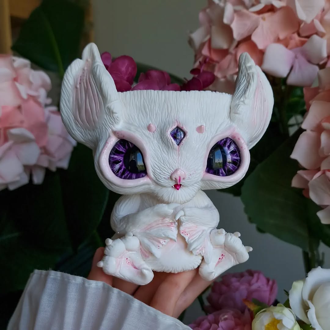 The cutest little vampire in the world🦇💔 This baby bat rests on a stand adorned with natural rose quartz💫 — a stone of love, softness, and a touch of moonlit magic.